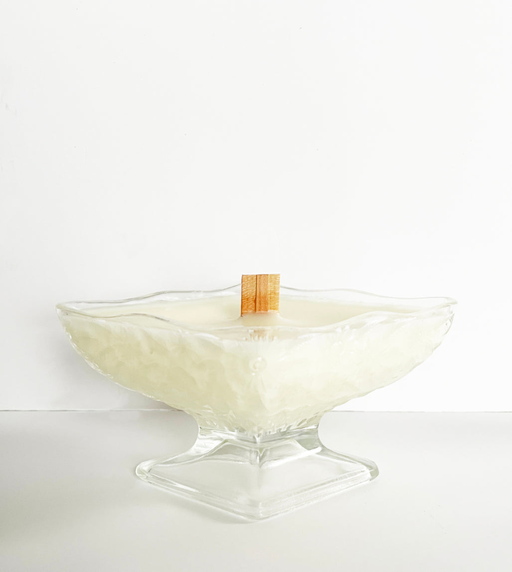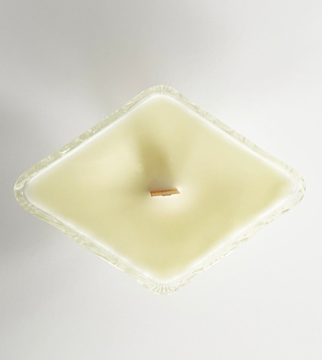Amelia is a lovely diamond shaped pressed glass candy dish. She has a clear glass footed with flower fern and diamond pattern. Dimensions 6.5" wide and 4.5" in diameter and 3" in height. Ameila's notes are hot apple cider, orange zest, warm spices and sweet vanilla.