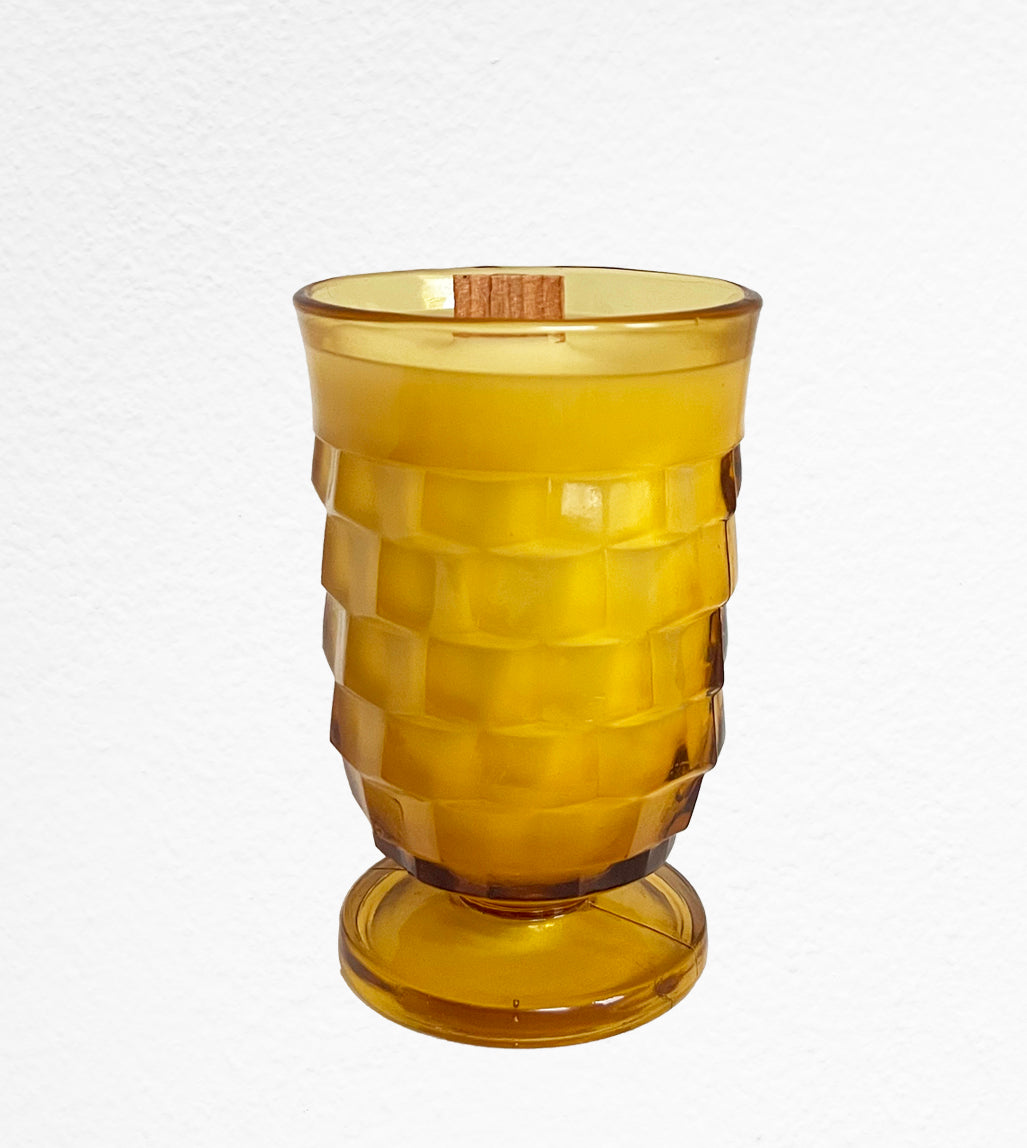 Artie is a Whitehall amber 9 oz footed juice glass. His scent notes are bergamot, mahogany, spice, lavender, musk and vanilla. Artie is 2.5 inches in diameter and 4 inches tall.