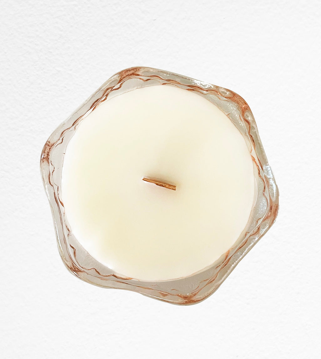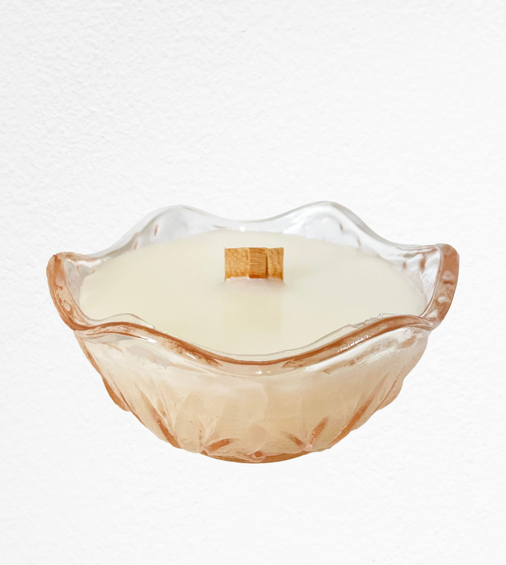 Azzi is a vintage pink depression glass dish. This cute piece can be used to hold jewelry or other items afterwards. Azzi is 4.35 inches in diameter and 2 inches tall. She has scent notes of citrus, bergamot, cactus flower and cashmere woods.