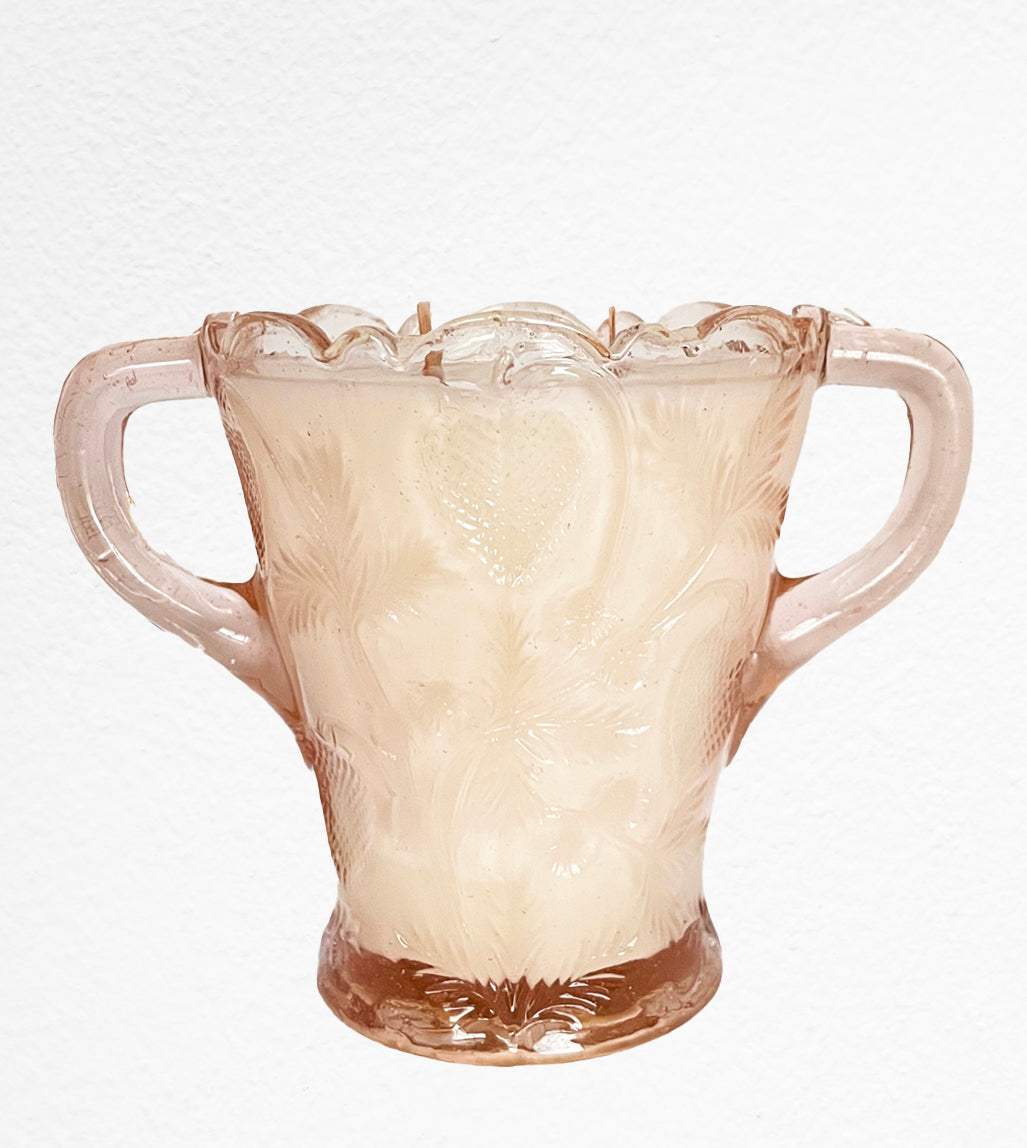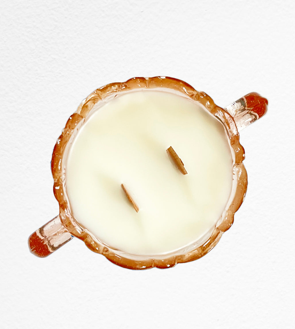 Bennett is a pretty pink depression glass dish. She is large and substantial, making for a long lasting candle with two crackling wood wicks. She is filled with our ever popular, winter scent-Velvet Slippers. With notes of hinoki wood, vanilla, white peppercorn and cypress needle, this beauty will fill your space with such an aromatic bliss. Bennett stands tall at 5 inches and has a diameter of 7 inches with the handles.