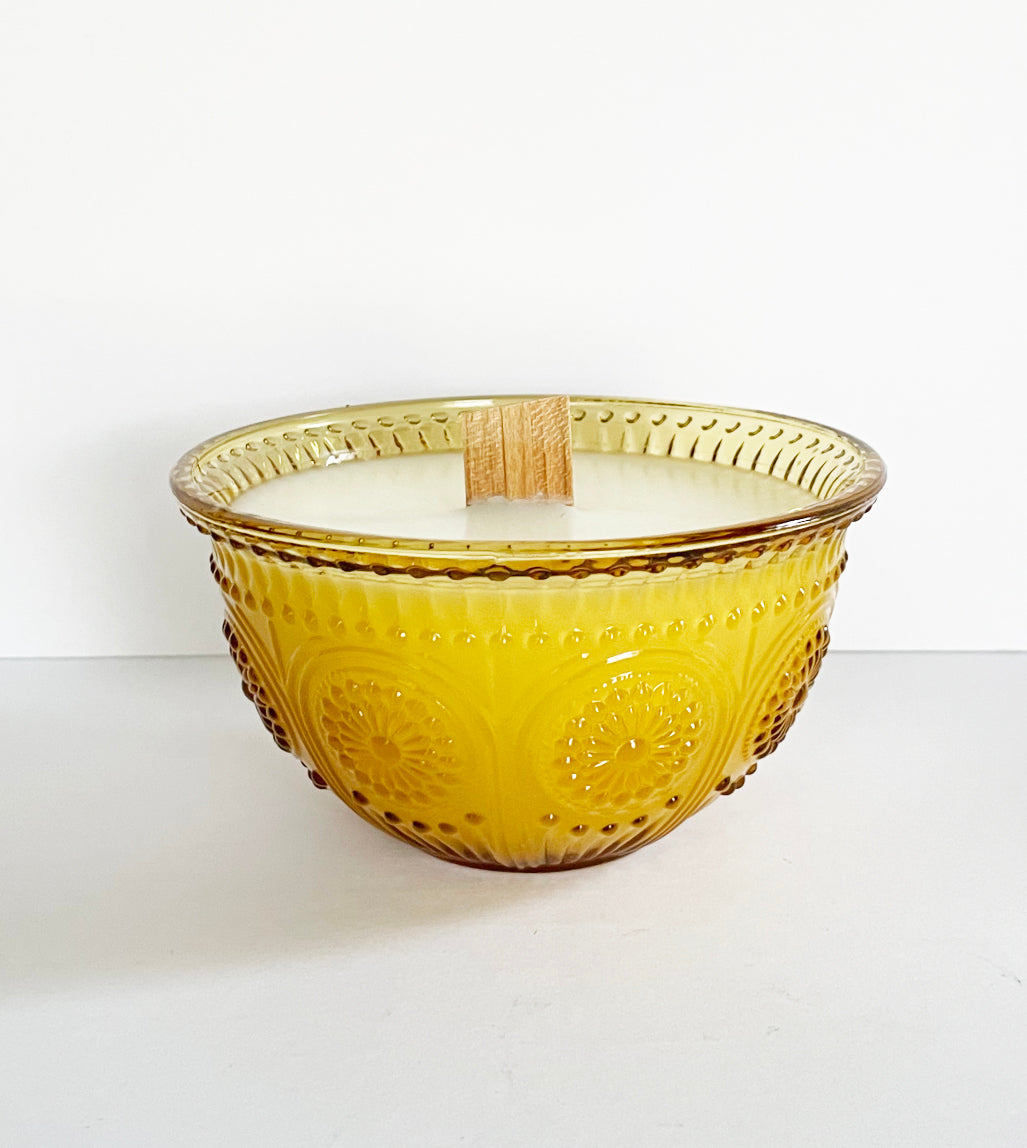 Bobby is Sally's brother. He's also a vintage flower embossed glass bowl. This light amber color would be so pretty in any space. Bobby is 5" in diameter and 2.5" high, with a cracking wood wick. Perfect for holding trinkets, keys or snacks!