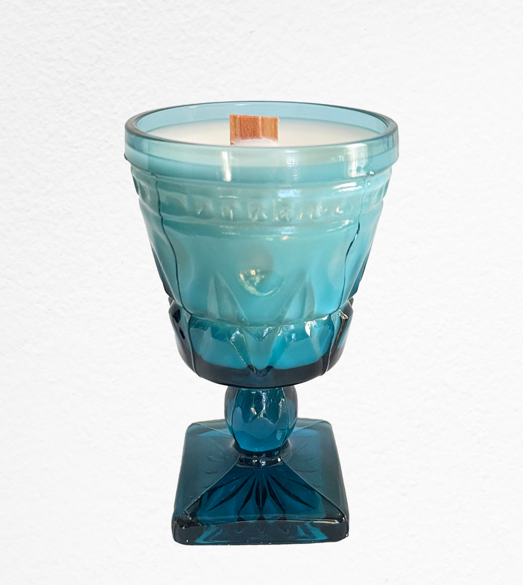 Charlotte is a gorgeous vintage blue square foot apertif cordial glass. This mid century gem is filed with our delicious Breakfast in Paris scent that will stop you in your tracks at first whiff. Charlotte is the perfect little glass at 4.5 inches tall and 2.75 inches in diameter.