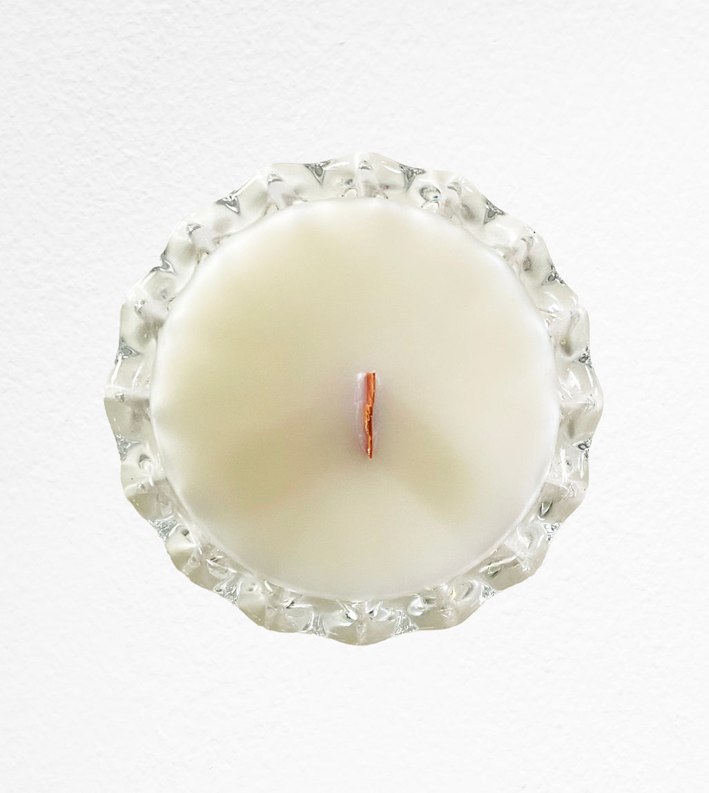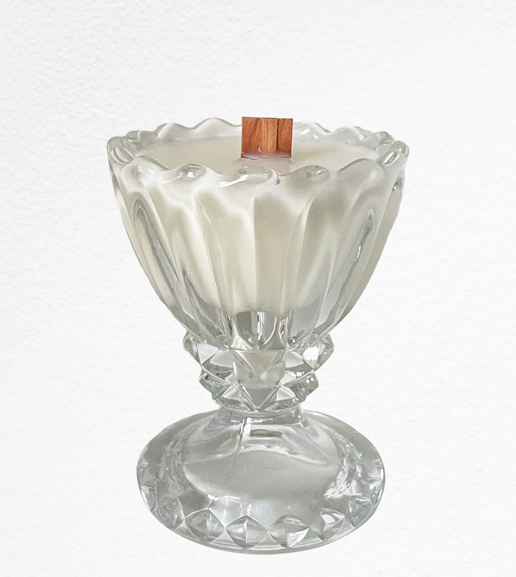 Christina is a rare unique vintage clear glass sundae dish. She's sturdy, with so many amazing details-with a scalloped edge and a large base featuring a diamond pattern. This dish would be a pretty jewelry holder in it's next stage. This beauty is 3.25 inches in diameter and 4.75 inches tall, filled with our Rainbow Puffs scent.