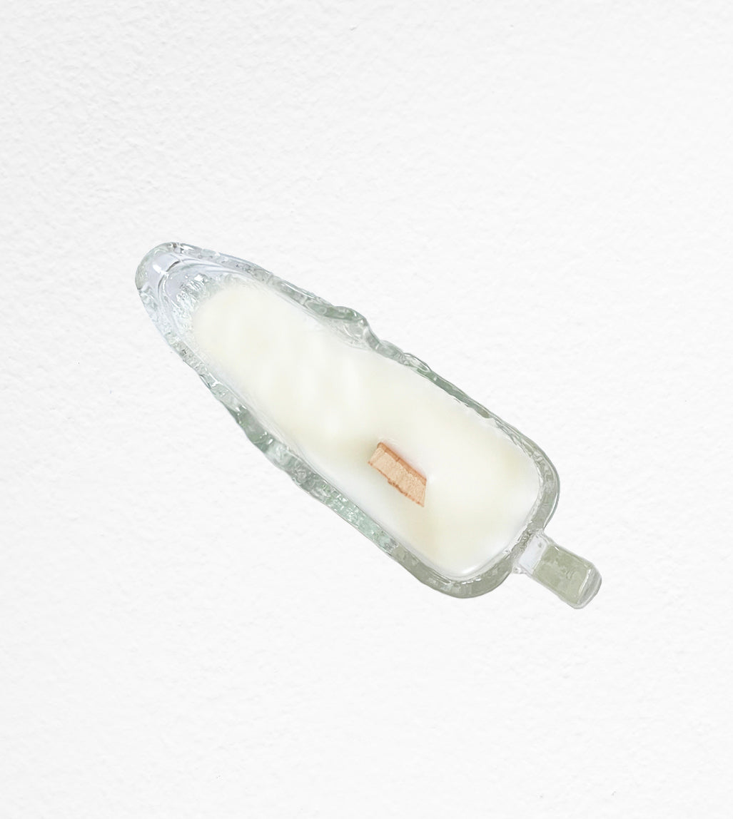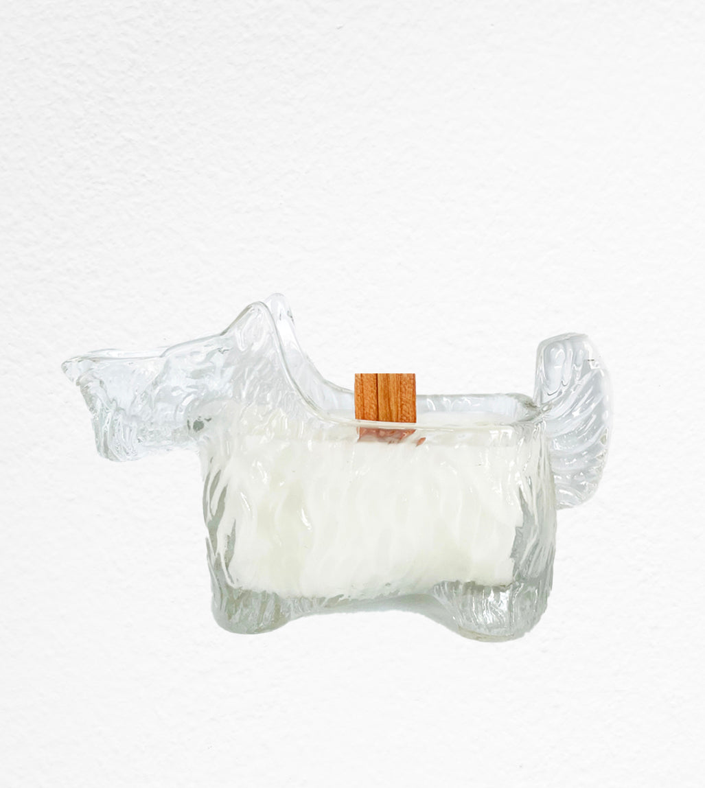 Clifford is a vintage glass terrier candy dish creamer. He is 6" wide so dang cute. This piece is a very fun and whimsy piece for any dog lover! Clifford is filled with our ever popular Breakfast in Paris scent.