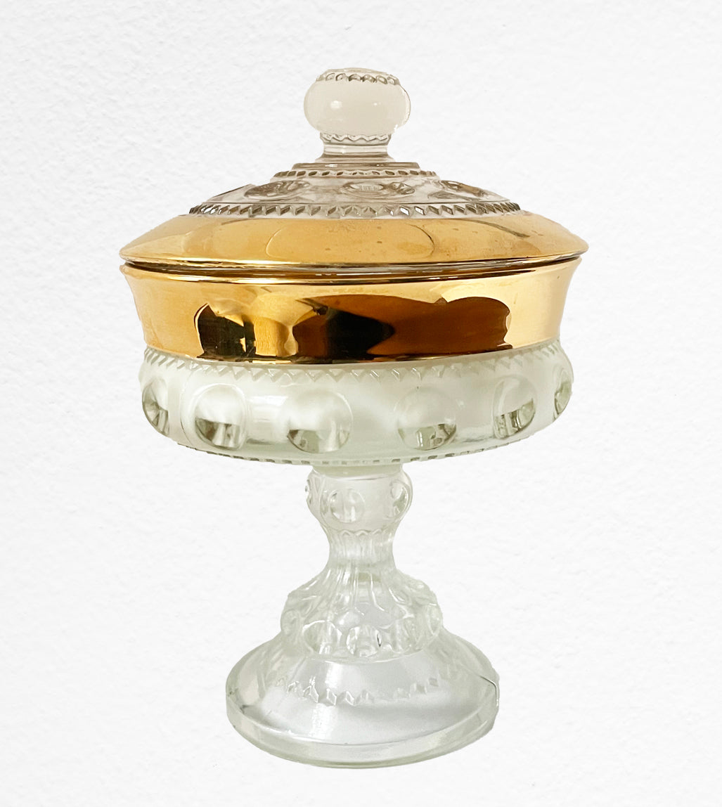 Colette is a stunning vintage Indiana Glass Kings Crown compote/candy dish. Her scent notes are fir needle, cinnamon stick, cranberries, crisp apple and cedar wood. Colette measures 7.5 inches tall and a little over 5 inches in diameter.