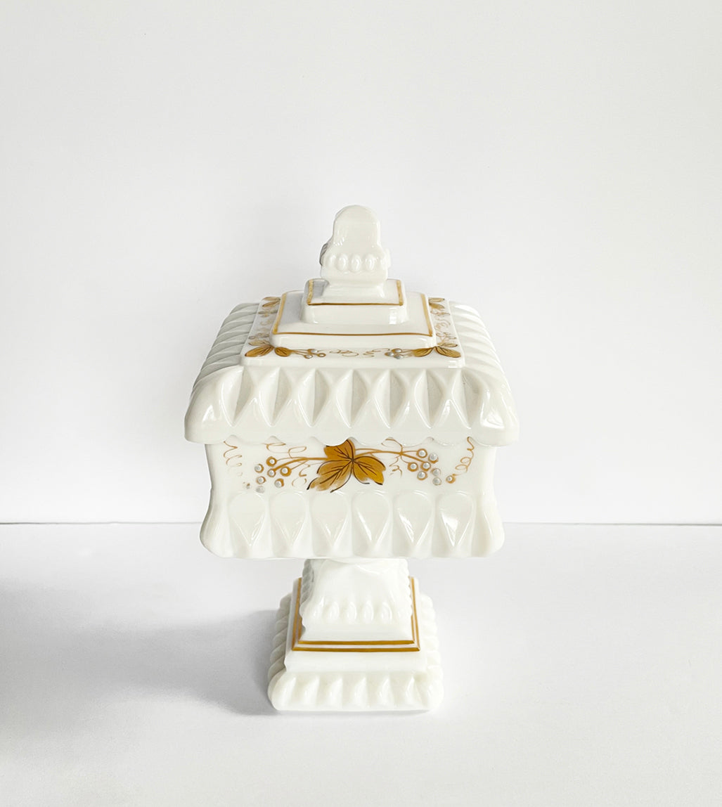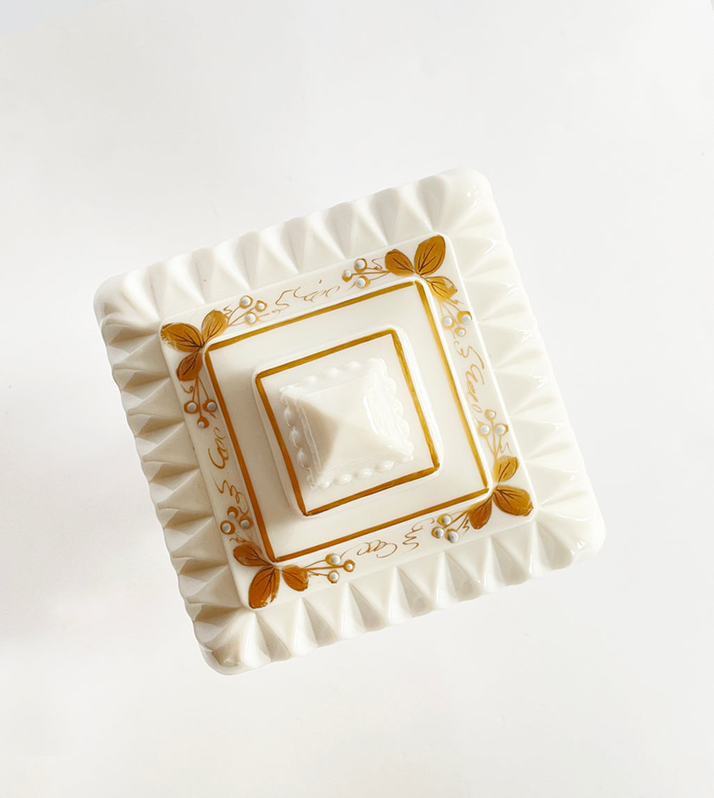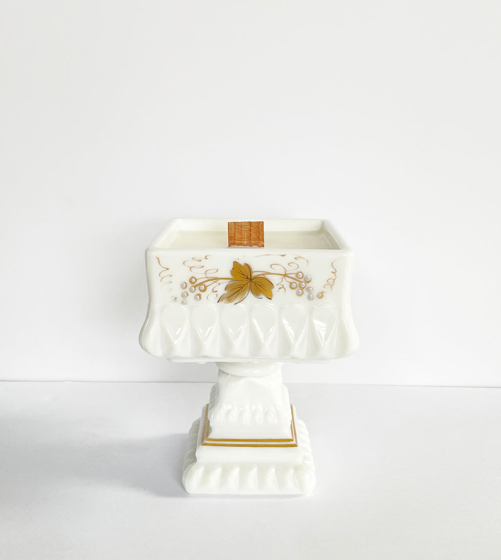 Cora is a vintage pedestal covered dish is covered with a hand painted gold leaf and grape design around the entire dish. Not many of these Westmorland pieces have the gold trim and in excellent condition with no wear, chips or cracks. This dish is a rare find. She measures approximately 9" in height and 4 1/8" square. The candle notes are hinoki wood, vanilla, white peppercorn and cypress needle.