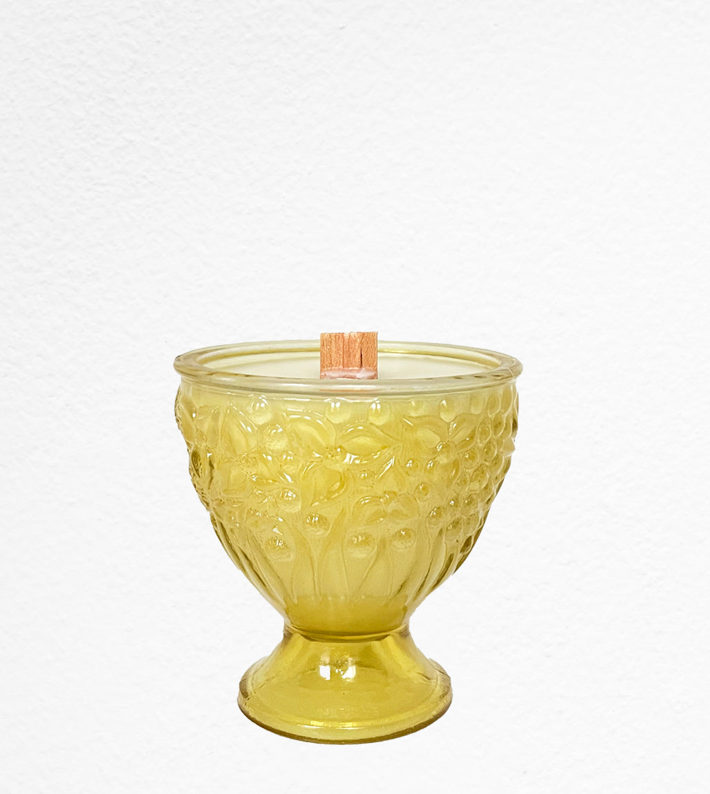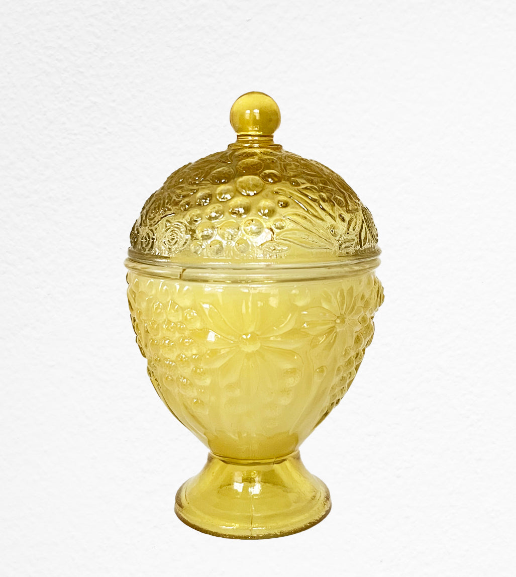 Darcy is a vintage Avon embossed floral yellow glass jar with lid. She dates back tot he 1950's and measures at 6.5 inches tall with the lid and 3.5 inches wide. Darcy has notes of anjou pear, apple, amber, peony, white musk, amber and lemon leaves. |