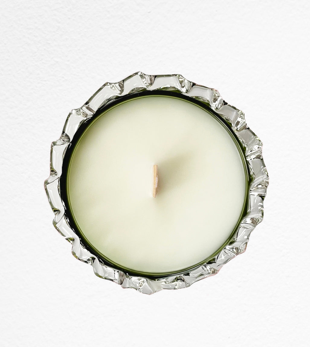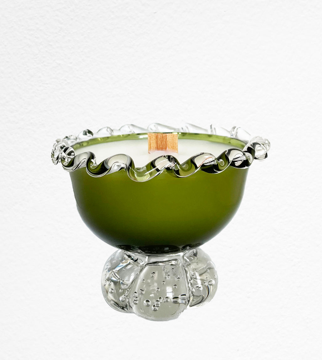 Dixon is a vintage clear art glass controlled bubble base 4" candy dish with a green ruffled edge. Dixon is so handsome an would make such a great home decor piece anywhere. He measures 3 3/4” high x 4” wide. Dixon is hand poured with a delightful scent of Firevergreen with notes of siberian fir, blue spruce, crystalized ginger and cedar wood.