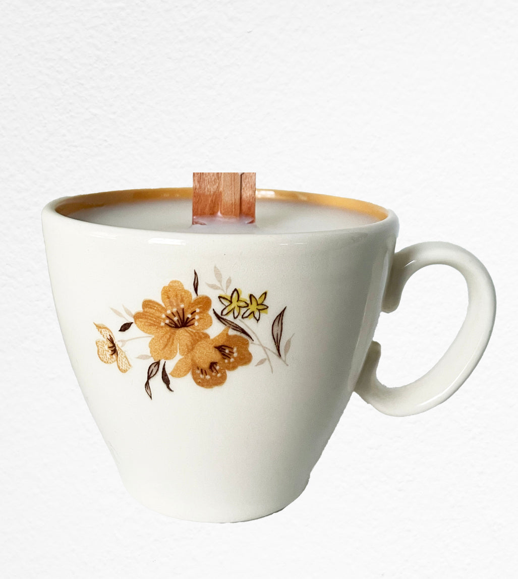 Edna is a vintage Wood Rose Ever Yours by Taylor Smith and Taylor TSTT cup. The cup is 3.5 inches in diameter and 3 inches tall. The scent notes are vanilla, tobacco, white tea, saffron, sandalwood and tonka.