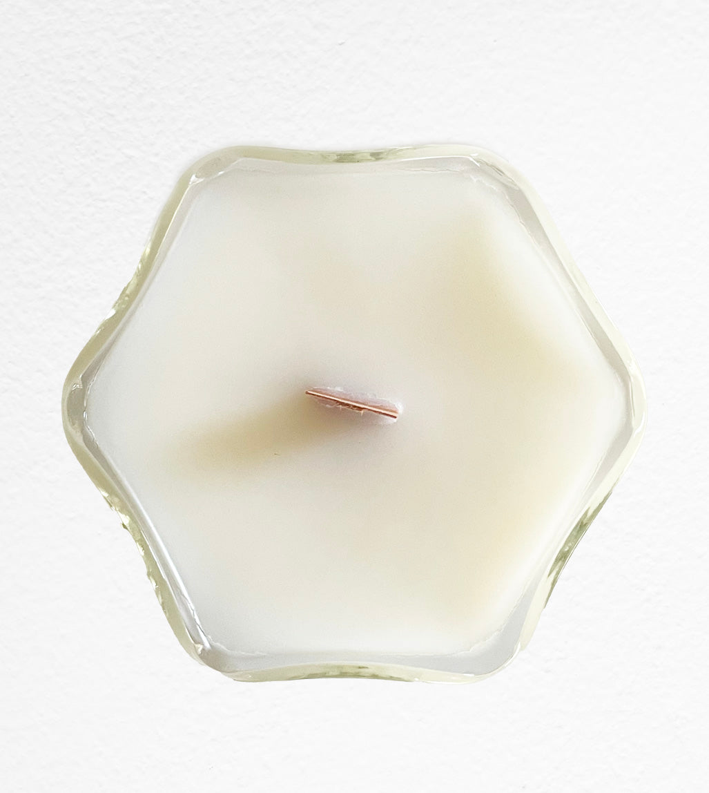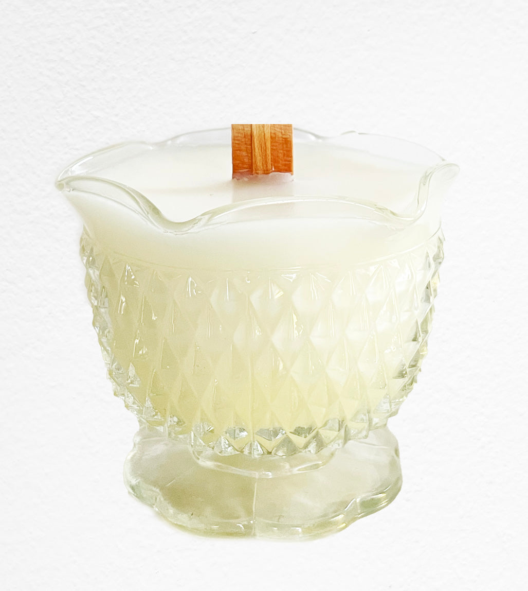 Ella is a vintage Indiana glass sundae dish with a diamond point clear pattern. Ella measures 3.25 inches tall and 4 inches in diameter. She is filled with the scent notes of palo santo, cypress, amber, eucalyptus and patchouli.