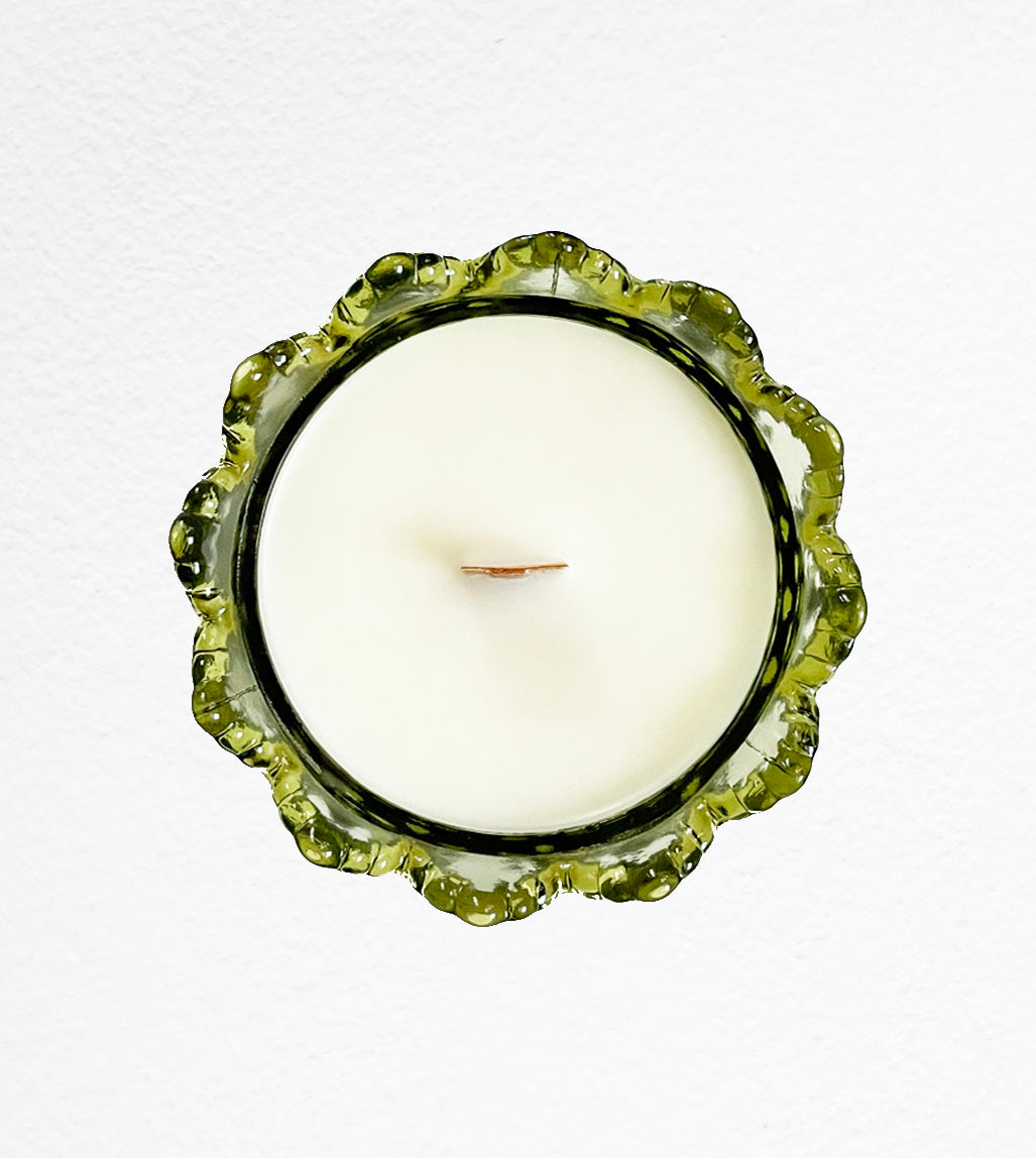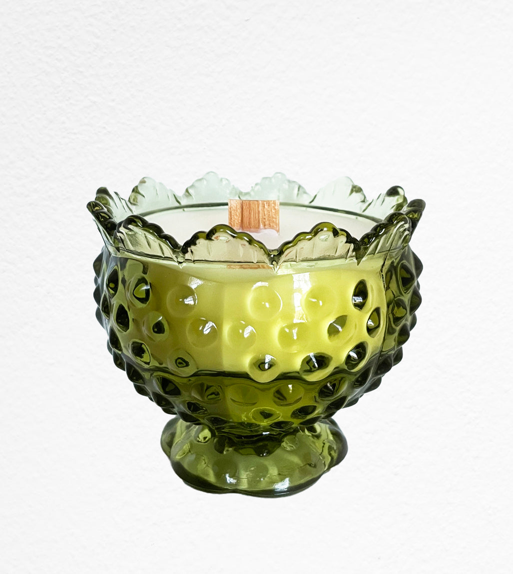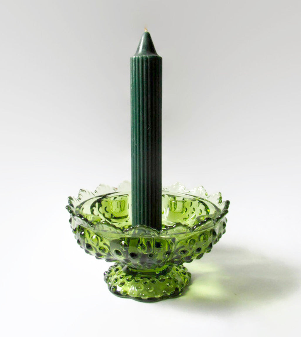 Elton is a vintage green Fenton Colonial Green Hobnail Candle Holder. This elegant patterned candle holder/centerpiece is 3 5/8" in height at the 6 5/8" diameter lip, and tapers to rest on a 3 3/4" diameter foot. After burning this candle, which is hand poured with our Breakfast in Paris scent, you can use it to hold a taper or a pillar candle.