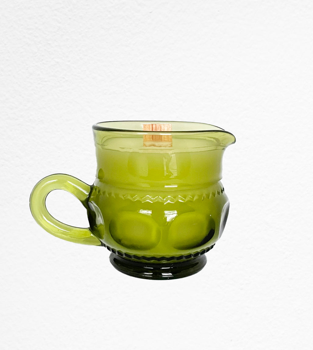 Emile is a vintage Indiana Kings Crown Thumbprint Creamer in an avocado green glass. He is filled with our amazing Father Flannel scent with notes of woods, bergamot, mahogany and musk.