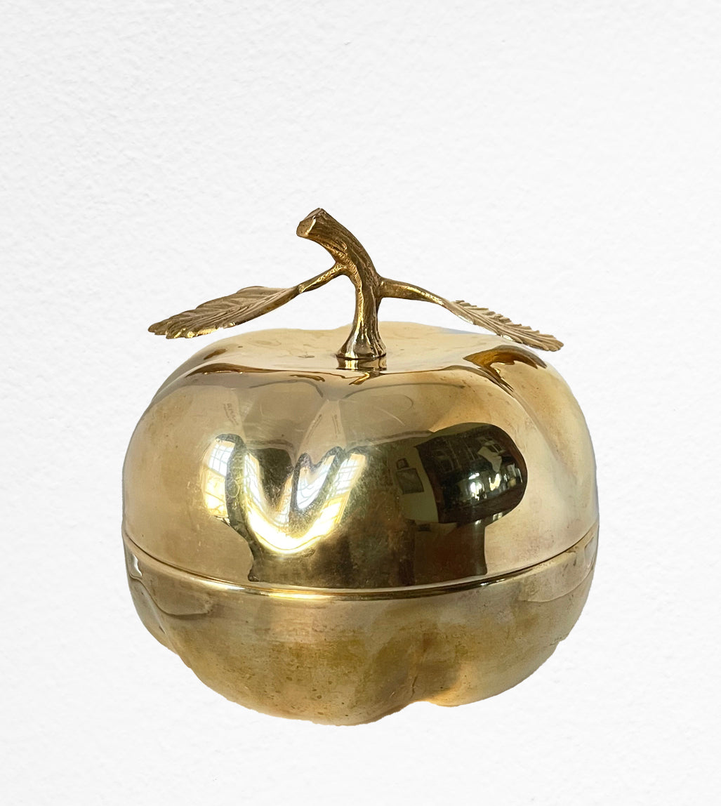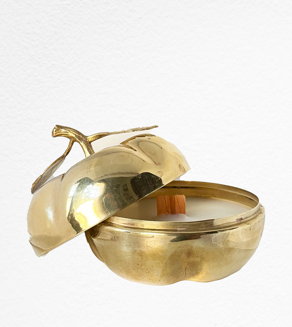 Eve is an incredible vintage solid brass apple container. It'd be a great addition to any kitchen, bookcase, or table, and can hold all kinds of things! She has a great look, especially with the detailed leaf design. Her scent notes are apples with cardamom, bergamot, caramel, brandy and cedarwood. She measures 4.5 inches tall and 5 inches wide.
