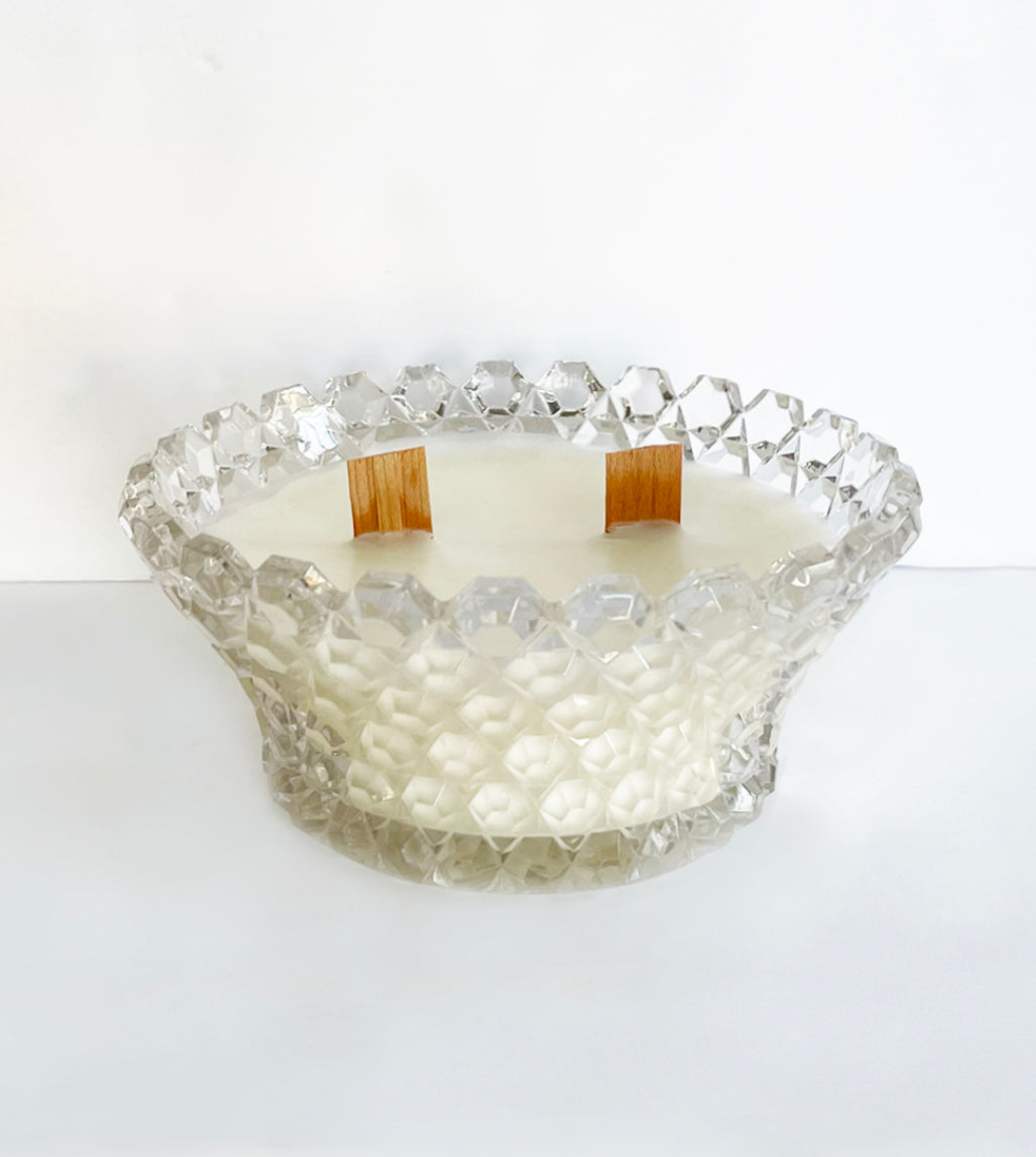 Felix is a gorgeous glass dish with saw tooth edge hexagon shaped clear hobnail diamond points. With a unique shape and vintage, we believe Felix to be a Vintage English Hobnail Westmoreland piece fromt eh 1950's. This dish is a rare find and is filled with the notes of fir needle, cinnamon stick cranberries, crisp apple and cedarwood. The dimension are 6.25" diameter 3" tall.