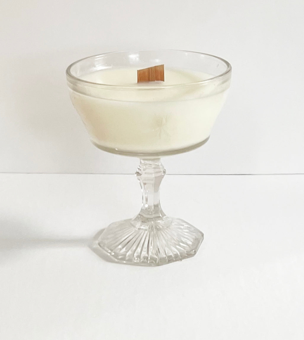 George is a gorgeous clear glass with a pedastal. She measures 5.75" tall 5.25" in diameter.