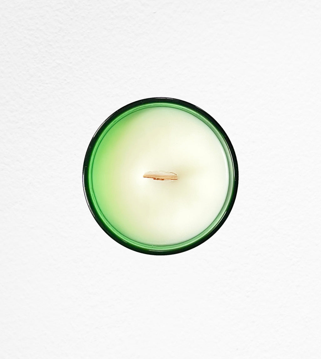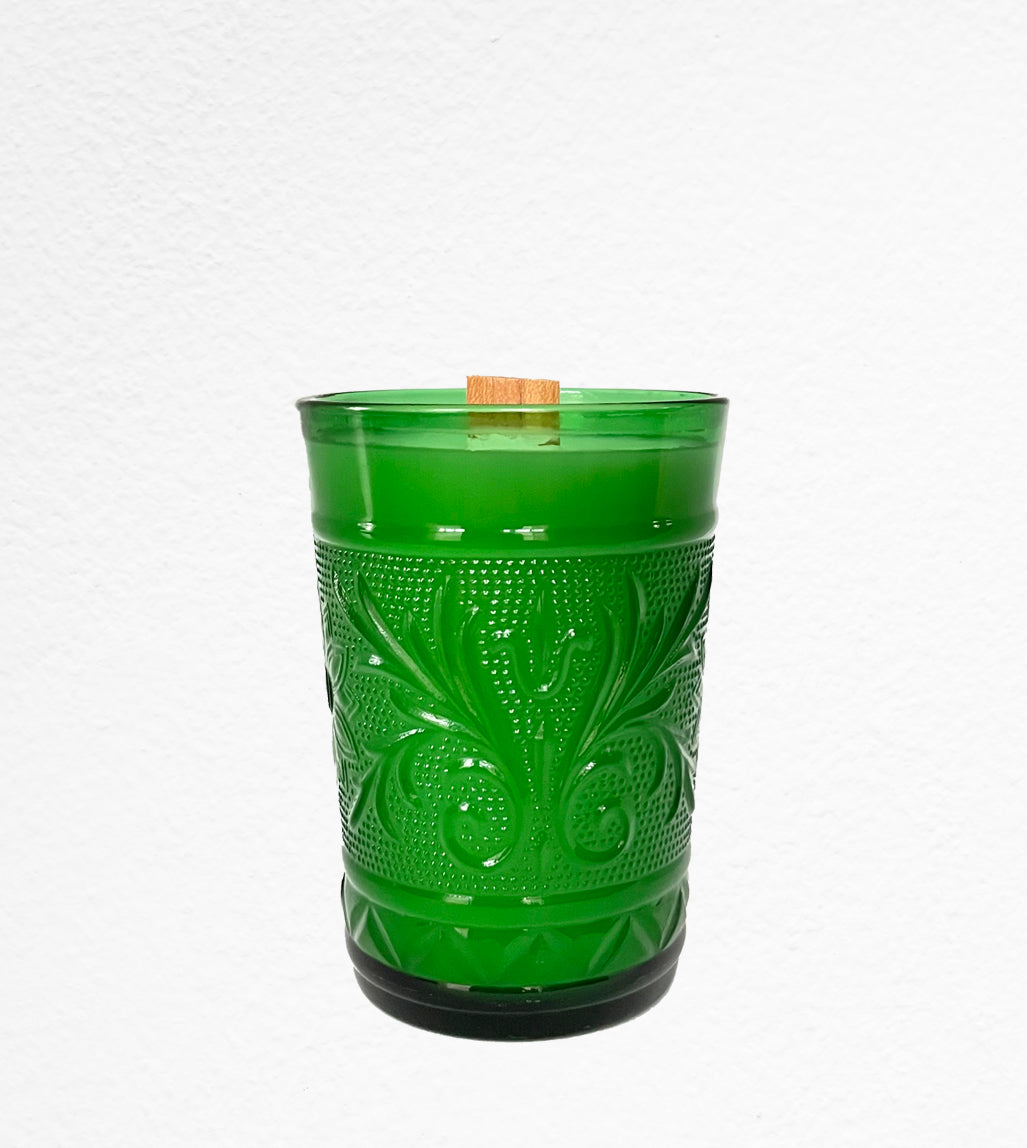 Gert is an Anchor Hocking vintage forest green sandwich glass from the 1950's. He's a beautiful deep green color with flowers and scroll work alternating around the glass, tiny dots in the background. Gert is 4 inches tall and 3 inches in diameter. The notes are siberian fir, blue spruce, crystalized ginger and cedar wood.