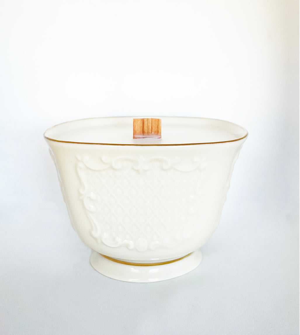 Grace is a Lenox porcelain footed bowl is trimmed with 24 karat gold around the top as well as the bottom. She has a beautiful lattice design around the bowl and it is part of the Canterbury series from the 1970's.