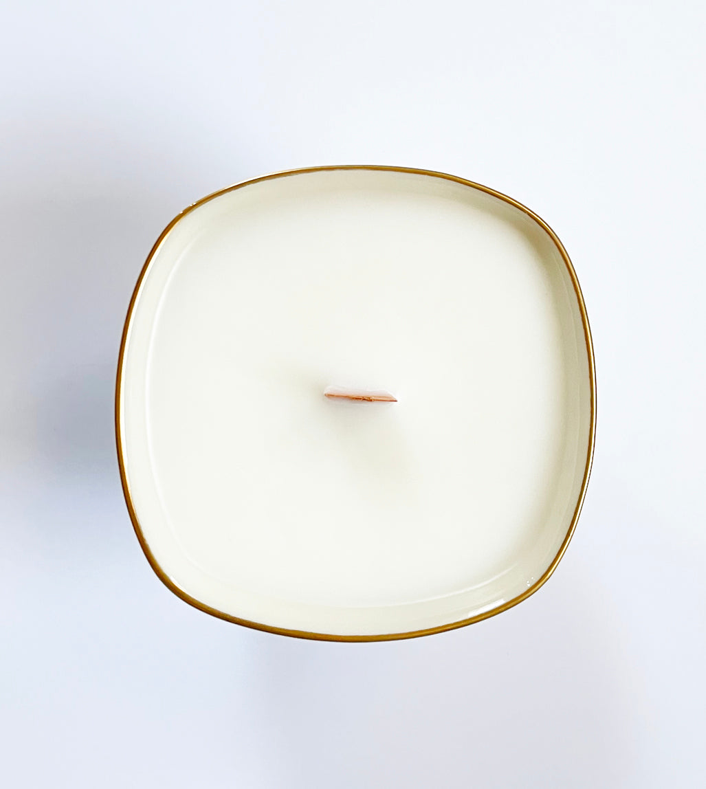 The measurements are 4"square, 3" high and base is 2 1/2". The notes are patchouli, sandalwood, amber, lavender and bergamot.