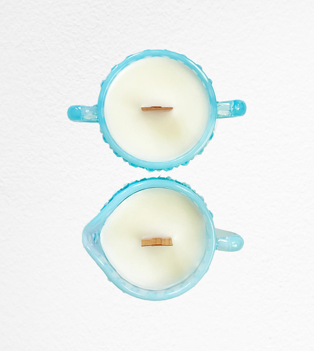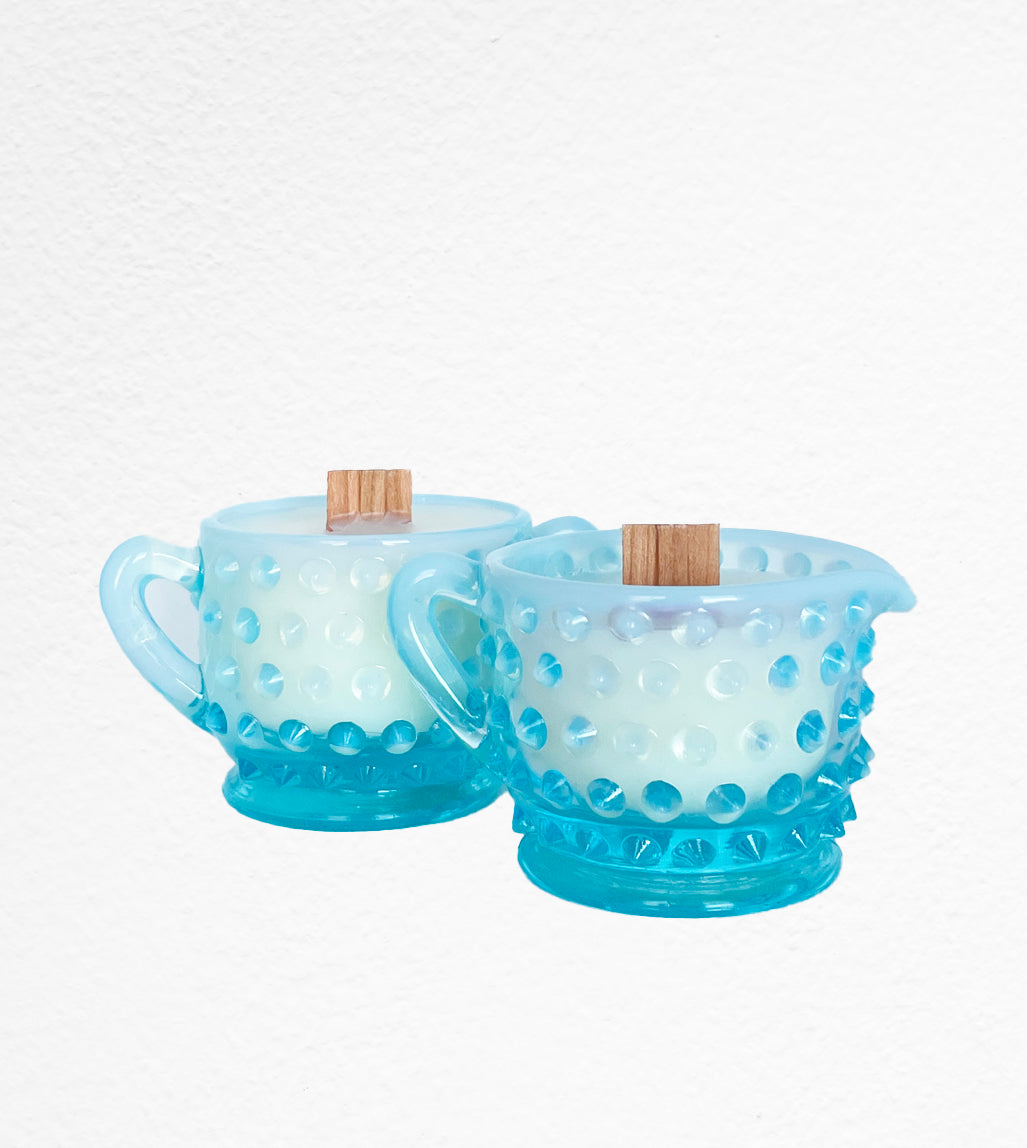 Harriet & Holly are a vintage Fenton opalescent blue hobnail miniature creamer and sugar bowl set. These cuties are in perfect condition and would be great jewelry dishes or decorative pieces to hold trinkets. They measure at about 2.5" tall. Harriet & Holly's notes are cologne inspired, with black amber musk.