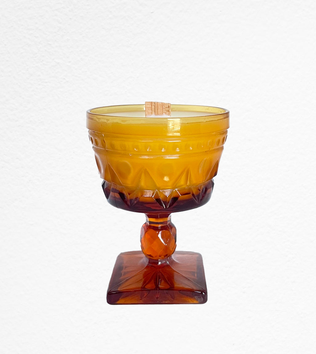 Harvey is a handsome Indiana pressed amber glass goblet. He is so gorgeous in color and sits nicely at 4.5" tall and 3.5" in diameter. Harvey's notes are plum, tobacco, guaiac wood and honeycomb.