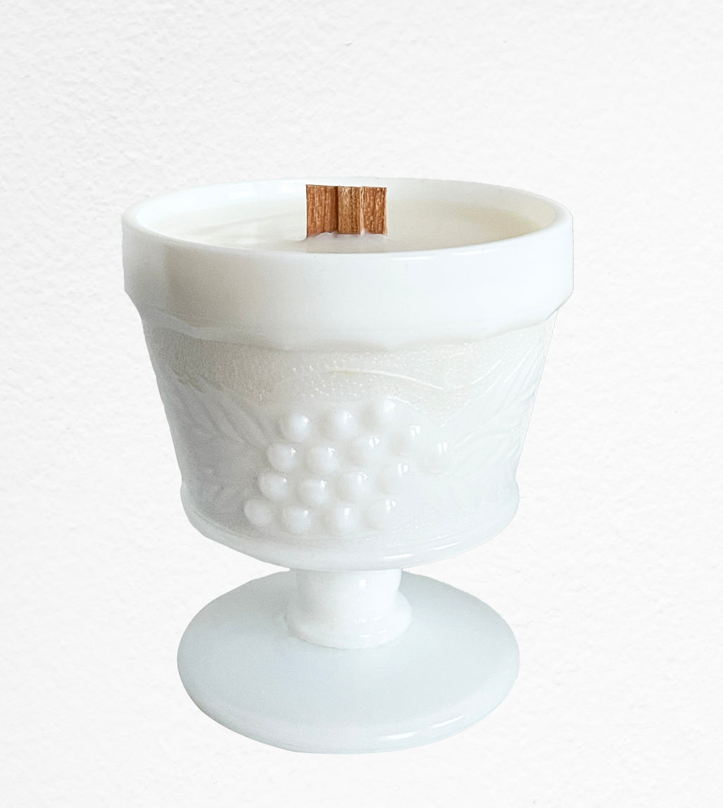 Jennifer is a vintage Anchor Hocking harvest grape milk glass sherbet dessert cup.