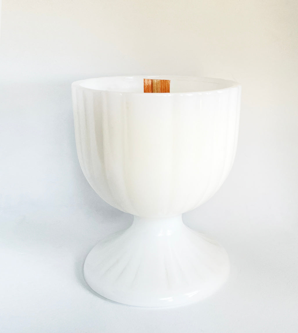 Joan is a vintage Pfaltzgraff, milk glass compote. She has a classic and clean design. Joan measures about 4.5" tall and 4" in diameter. She's got notes of hot apple cider, orange zest, warm spices and sweet vanilla.