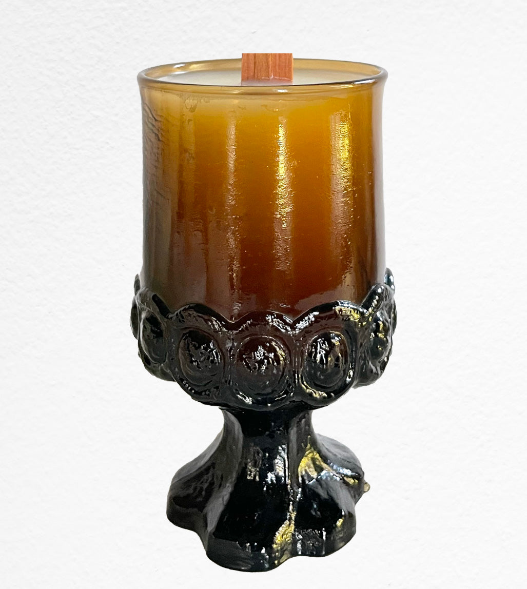 Joseph is a Franciscan Glass Madeira Footed Water Glass. The Madeira Smoke pattern was produced from 1972-76 and features thick, chunky glass with a ripple texture, raised ovals along the bottom, and petal shaped weighted bases. They have a brutalist aesthetic, which is enhanced by the smokey brown color. Joseph measures .375 inches wide and 3.5 inches tall and has scent notes of plum, tobacco, guaiacwood and honeycomb.
