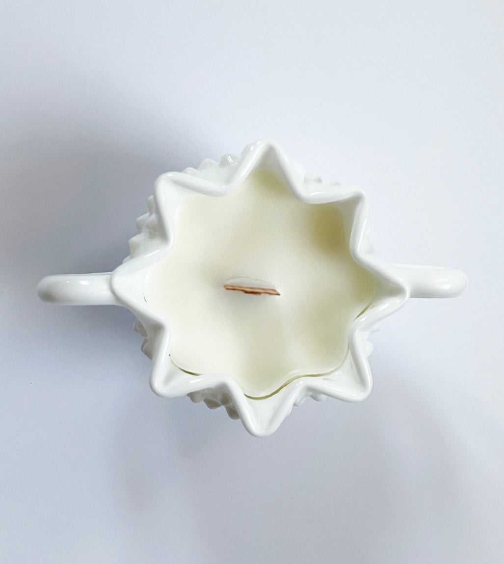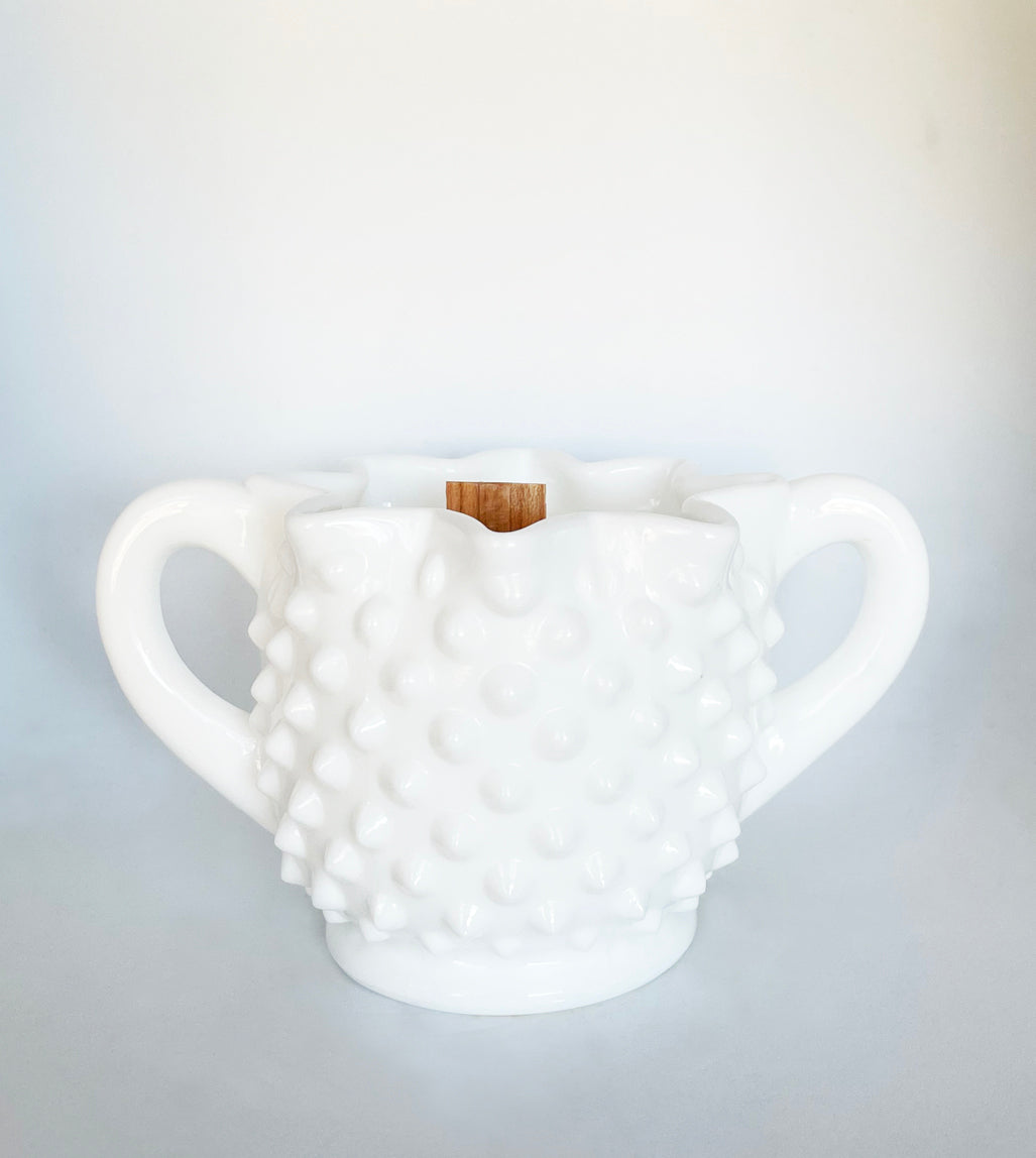 Mabel is a white hobnail milk glass Fenton sugar bowl.This cute bowl is in perfect condition and sits 3" tall. The notes are warm vanilla, musk, cinnamon, apple, pine and leaves.