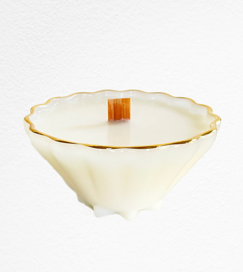 Madeline is a beautiful vintage milk glass dish with gold scalloped edges.