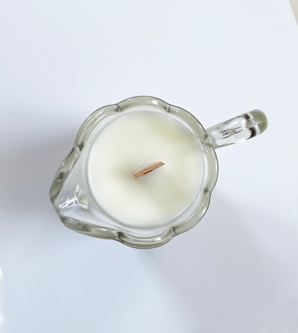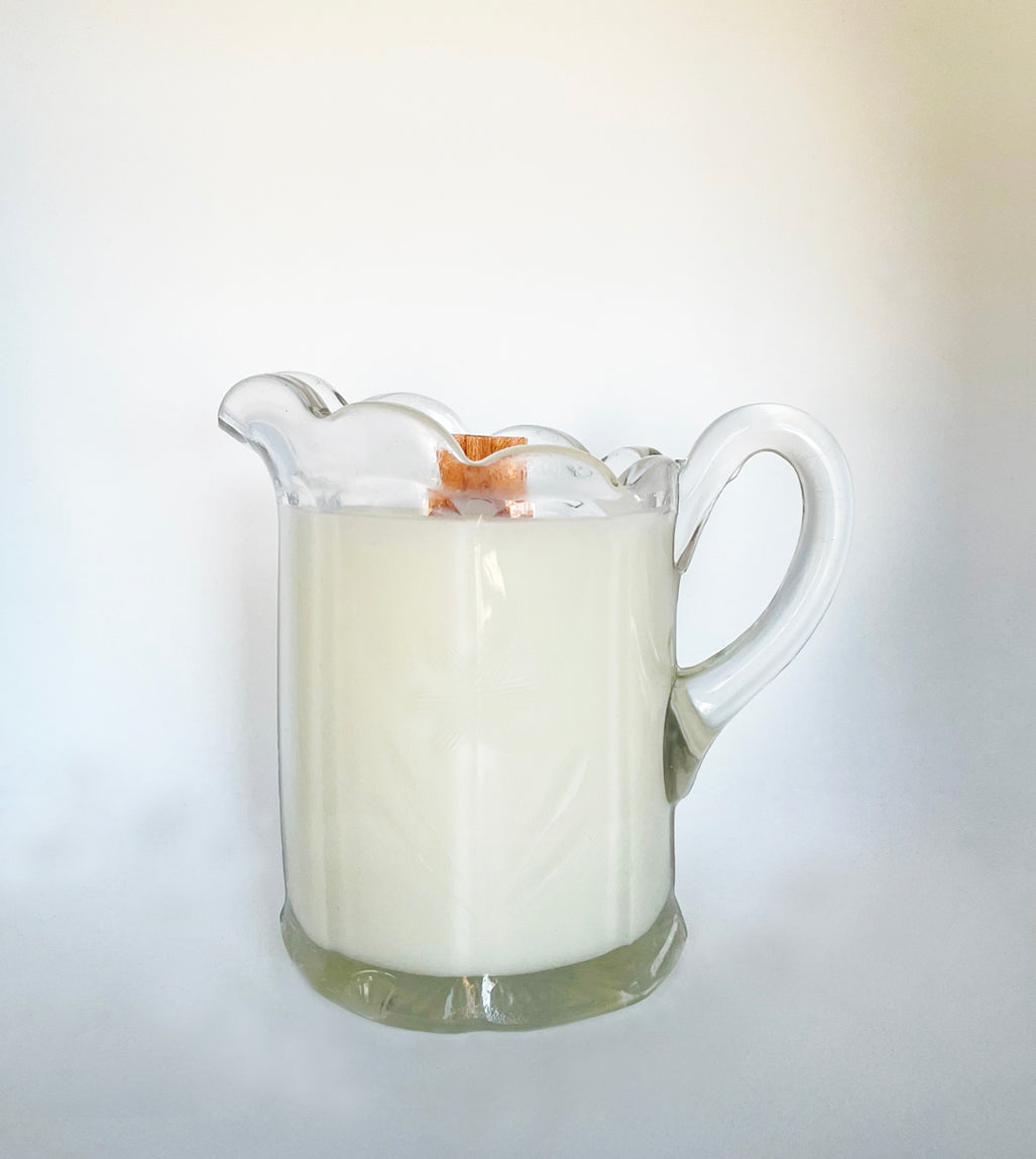 Martha is a vintage needle etched floral glass miniature pitcher shaped scalloped rim creamer. She is pressed glass that has been needle etched with flowers and leaves. It has a scalloped rim and the flower design on the bottom. Martha is 4" tall with notes of white tea, thyme, cucumber, violet, rose and jasmine.