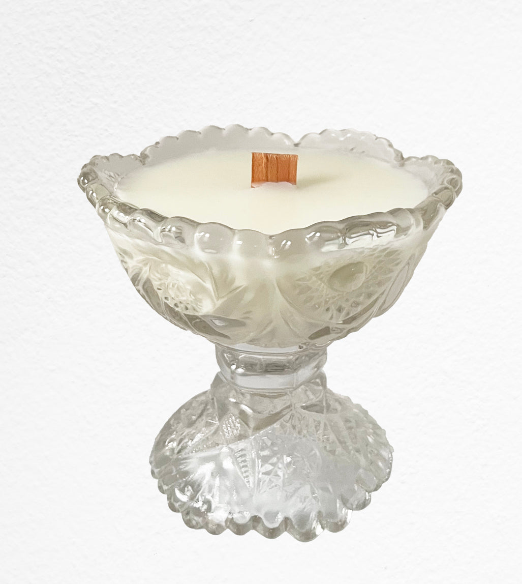 Norene is a clear compote pedestal designed candy dish. It is made of clear glass in an EAPG cut glass design. The top and bottom edges have a scalloped design. The body has a pinwheel design.