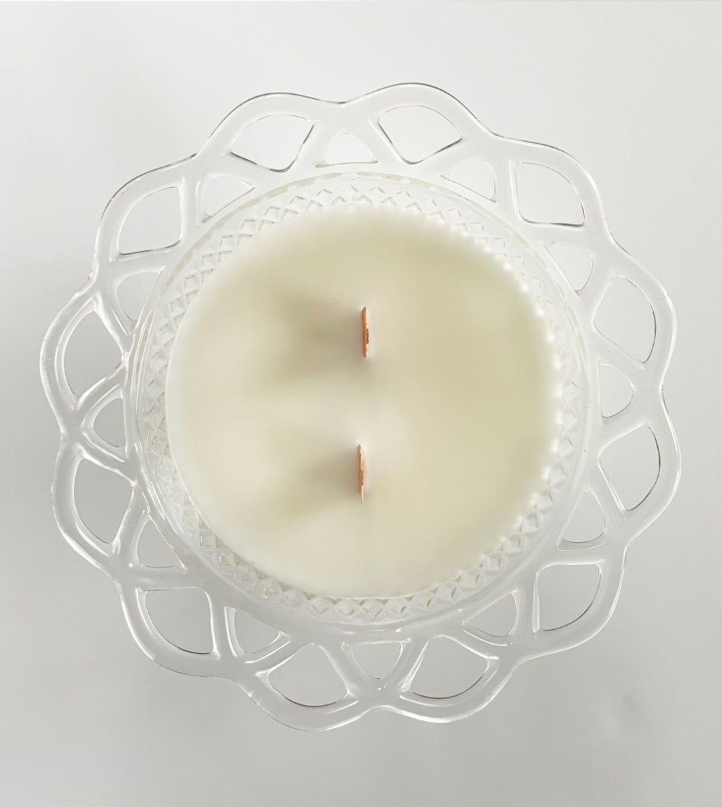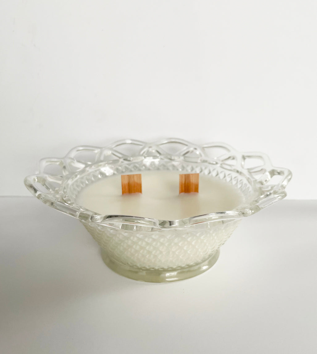 Peggy is a stunning vintage elegant glass Imperial laced edge rose Intaglio bowl from the 1930’s. She was crafted at the beginning of the Great Depression and has a lace upper rim with a diamond pattern on the sides and a deep satin finished intaglio roses pressed into the bottom. Peggy is approximately 7.5" in diameter and 2.5" tall. Her notes are coconut, vanilla musk, chamomile and lavender.