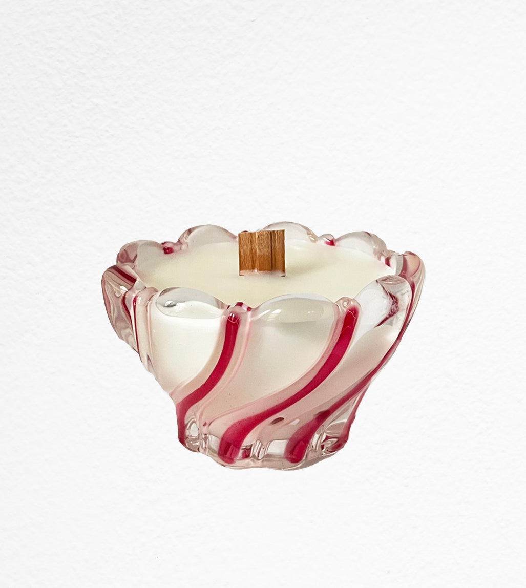 Posey is a clear and red glass candy bowl with swirling pattern and scalloped rim in the "Peppermint Green" pattern by Mikasa. The bowl measures 4 1/4" across the rim, 2 1/2" across the pedestal base, and is 2 1/2" high. Her scent notes are peppermint, sugar and vanilla.
