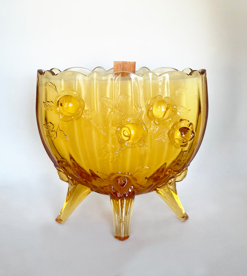 Rose is a stunning oval vase/bowl from Fenton. The vase features a beautiful cabbage rose pattern in amber glass that will look gorgeous in any setting. Measuring 5 inches in length, 4.5 inches in height, and 2 inches in width. the notes are spiced oak, tonka bean, sweet mahogany and clove.
