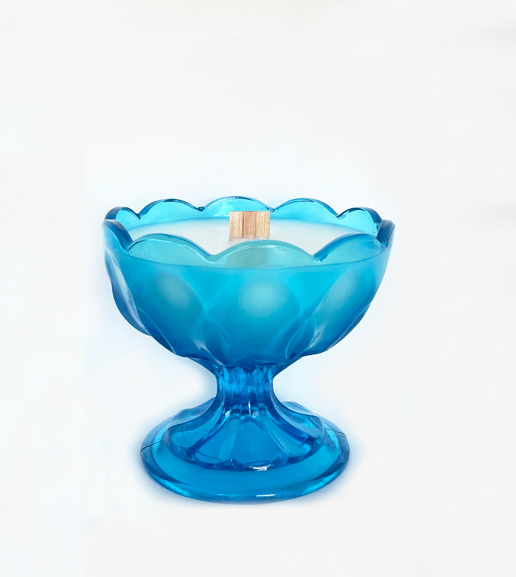 Selma is a vintage blue glass Anchor Hocking Fairfield dessert compote dish. She is such a beautiful blue hue that you can't help let her catch your eye. Selma measures 3.875 inches tall and 4.625 inches in diameter. Her scent notes are patchouli, cedar, lavender, clove and eucalyptus.