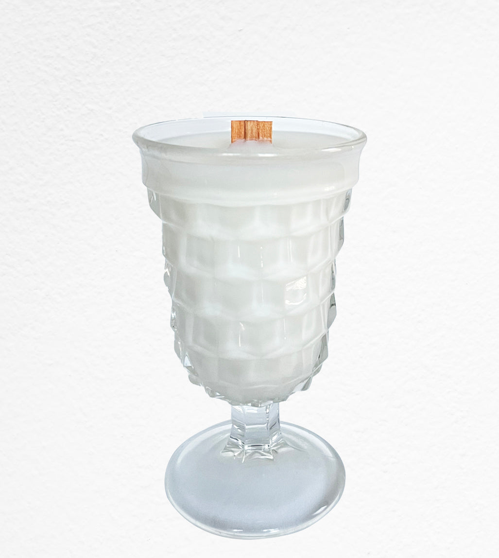 Una is a vintage low Cubist style water goblet by Fostoria. She measures 3.25 inches in diameter and 5.5 inches tall. Una has scent notes with anjou pear, apple, amber, peony, white musk, amber and lemon leaves.