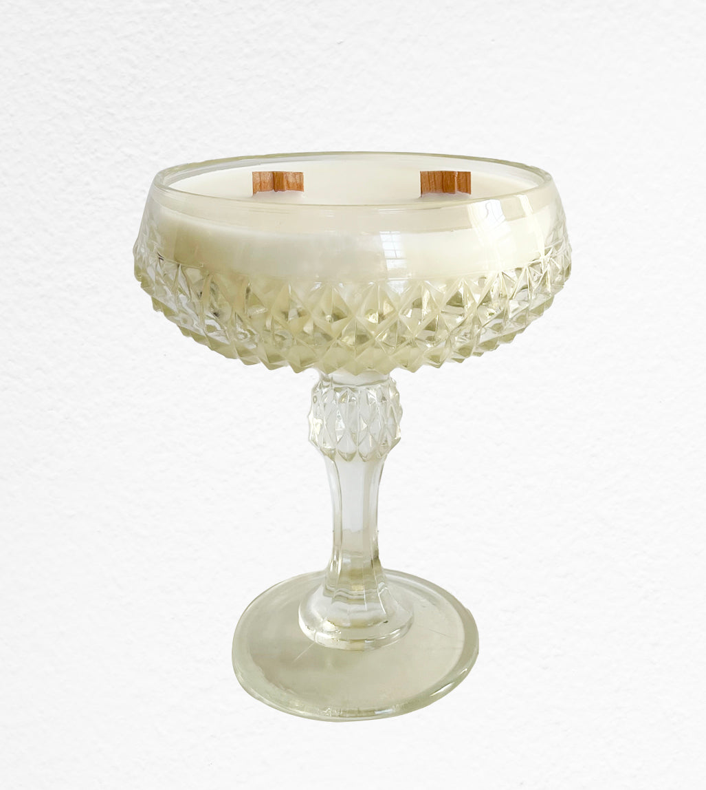 Verity is a grand vintage drinking glass. This glass is elegant and gives a glam vibe. Verity measures at a nice 7.25 inches tall and 5.75 inches in diameter- makes for a long lasting candle. Verity's notes are
