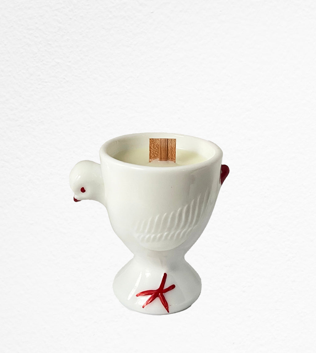 Wyatt is a vintage figural egg cup by Westmoreland. He is a milk glass chick cup for a large egg. The egg holder is large 2.5 inches wide x 2.25 inches deep. The entire piece measures 3.75 inches tall and 4 inches wide.