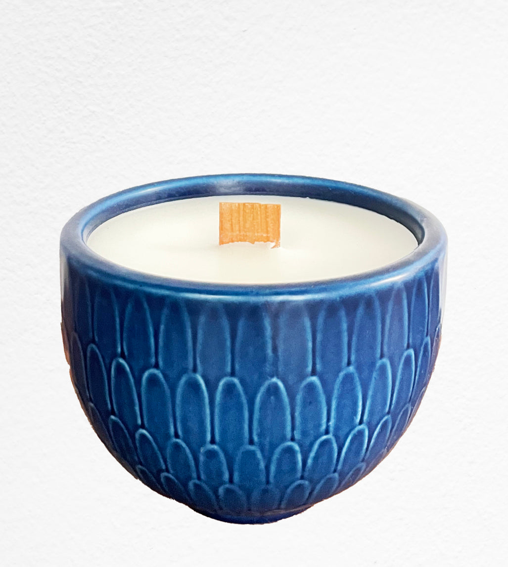 Zula is a Nils Thorsson stoneware bowl by Nils Thorsson for Alumina Royal Copenhagen factory (Denmark),"Marselis" series, friezes decor in blue enameled bas relief from the 50's. Zula has the scent notes of crips North woods, autumn air and oak wood. Her dimensions are 3.5 inches tall and 4.5 inches in diameter.